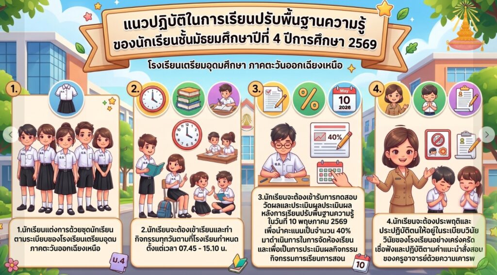 กำหนดการและแนวปฏิบัติในการเรียนปรับพื้นฐานความรู้นักเรียน ชั้นมัธยมศึกษาปีที่ 4 ปีการศึกษา 2569 และกำหนดการเปิดภาคเรียนที่ 1 ปีการศึกษา 2569