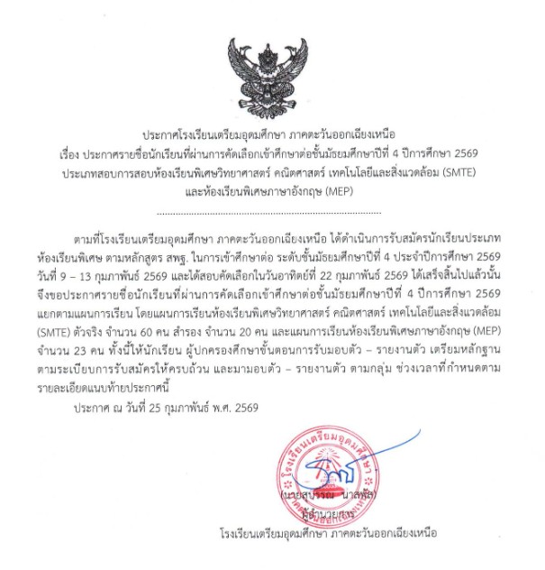ประกาศ รายชื่อผู้มีสิทธิ์สอบคัดเลือกเข้าศึกษาต่อ ระดับชั้นมัธยมศึกษาปีที่ 4 ประจำปีการศึกษา 2569 ประเภทการสอบคัดเลือกห้องเรียนพิเศษวิทยาศาสตร์ คณิตศาสตร์ เทคโนโลยีและสิ่งแวดล้อม (SMTE) และห้องเรียนพิเศษภาษาอังกฤษ (MEP)