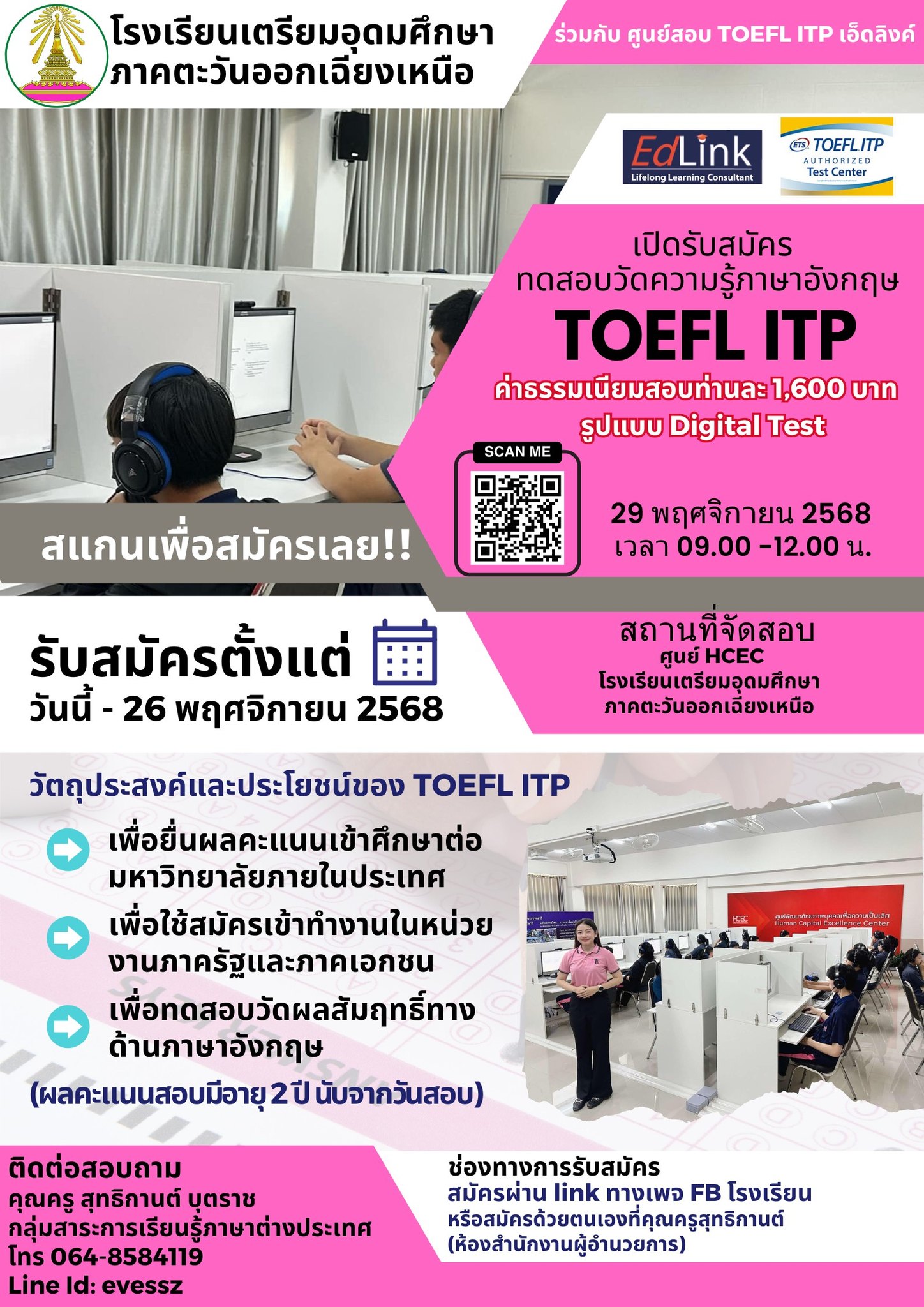 โรงเรียนเตรียมอุดมศึกษา ภาคตะวันออกเฉียงเหนือ ร่วมกับศูนย์สอบ TOEFL ITP เอ็ดลิงค์ เปิดรับสมัครทดสอบวัดความรู้ภาษาอังกฤษ TOEFL ITP ประจำเดือน พฤศจิกายน ประจำปีการศึกษา 2568 (รูปแบบ Digital Test)